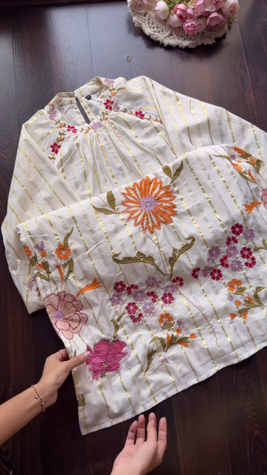 🌸 Design Highlights: Floral Embroidery & Gold Accents