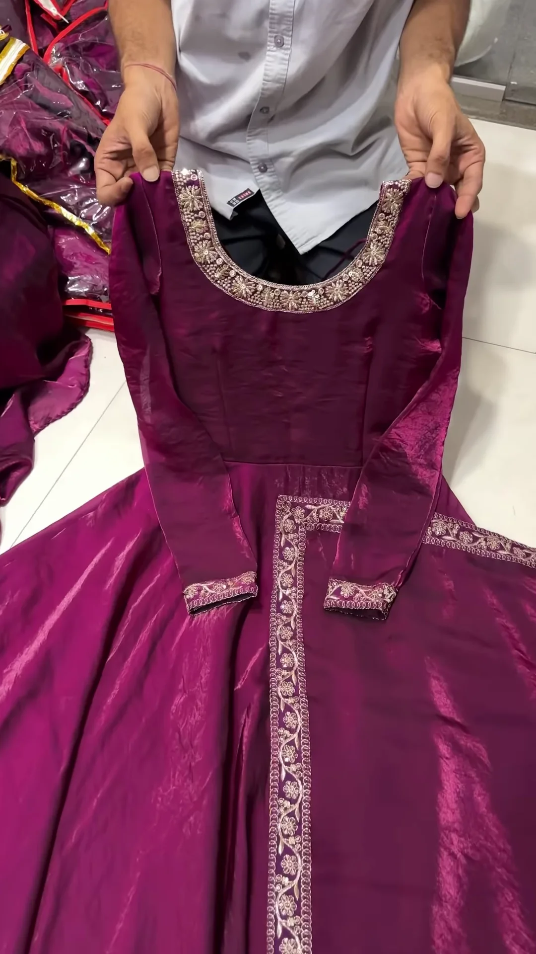 Step into elegance with this stunning wine-colored Anarkali gown, crafted to bring out the royal diva in you. Made from lustrous silk fabric, this gown features a floor-length flare that exudes grandeur with every twirl. The round neckline is beautifully adorned with intricate embroidery, adding a touch of grace and sophistication. The long sleeves are finished with matching embroidered cuffs, making this outfit perfect for special occasions.